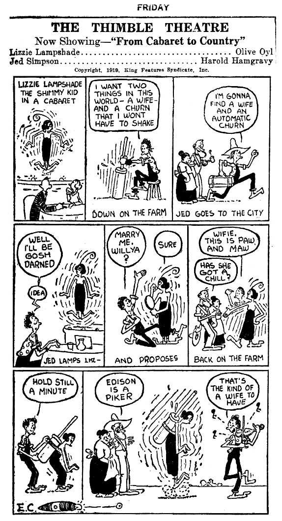 E.C. Segar begins work at William Randolph Hearst’s New York Journal where on December 19 he launches the “The Thimble Theatre” comic strip starring Olive Oyl and Harold Ham Gravy.