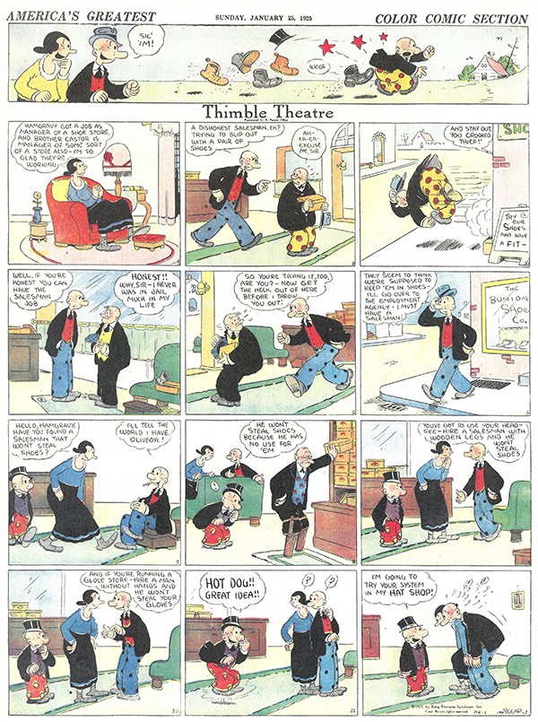 On January 25, the initial Sunday episode of "Thimble Theatre" is published and the cast grows to include Olive and Castor’s parents, Cole and Nana Oyl, then Castor’s wife, Cylinda, in 1926.