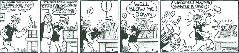 On July 24, Popeye finds the “infink” Swee'Pea on his doorstep and decides to adopt him.