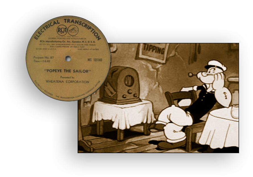 The Popeye the Sailor radio program airs 15-minute episodes three times a week. Supporting voices included Detmar Poppen as Popeye, Olive Lamoy as Olive Oyl, Charles Lawrence as Wimpy, Jackson Beck as Bluto and Mae Questel as Swee’Pea.