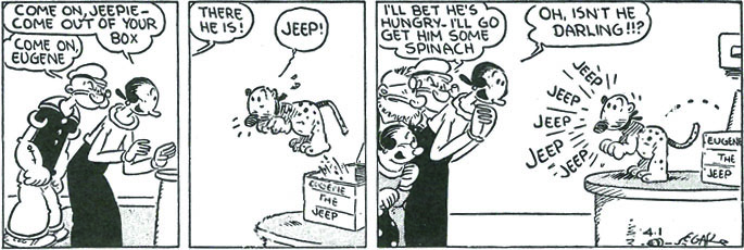 On March 16, Olive Oyl’s Uncle Ben gives her a gift – a pet named Eugene the Jeep — a mysterious, magical animal he found in Africa.