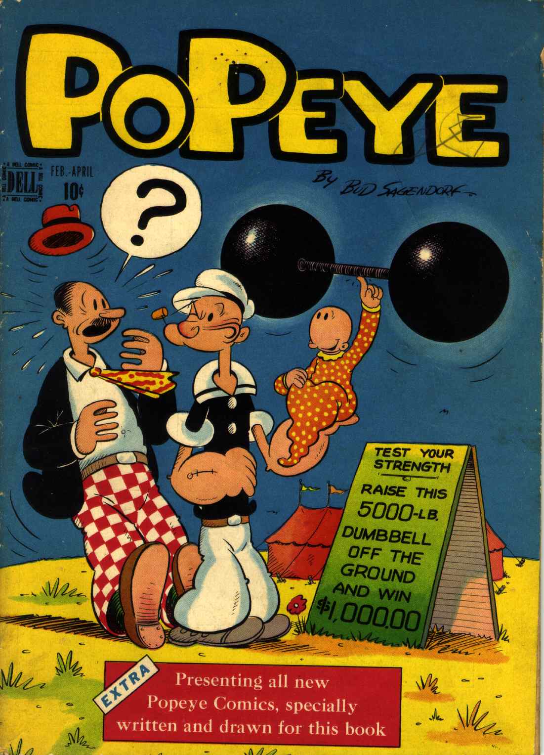 In February, Dell Comics publishes Popeye’s first comic book series, written by Bud Sagendorf. Later comic series were published by Gold Key, King Comics, Charlton Comics and Whitman Comics.