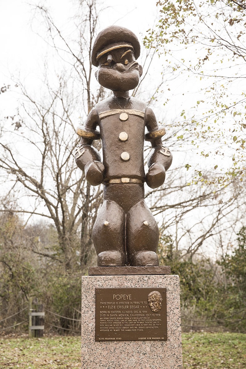 To honor Popeye’s creator, E.C. Segar, a 6 ft. tall, 900-pound bronze statue of Popeye is erected in Chester, IL in Elzie C. Segar Memorial Park. The “Home of Popeye,” Chester, IL was E.C. Segar’s birthplace and the Popeye & Friends Character Trail begins there. It includes statues honoring many other Thimble Theater characters, and features a new installment each year. An annual Popeye Picnic and parade is also held in Chester the weekend after Labor Day.