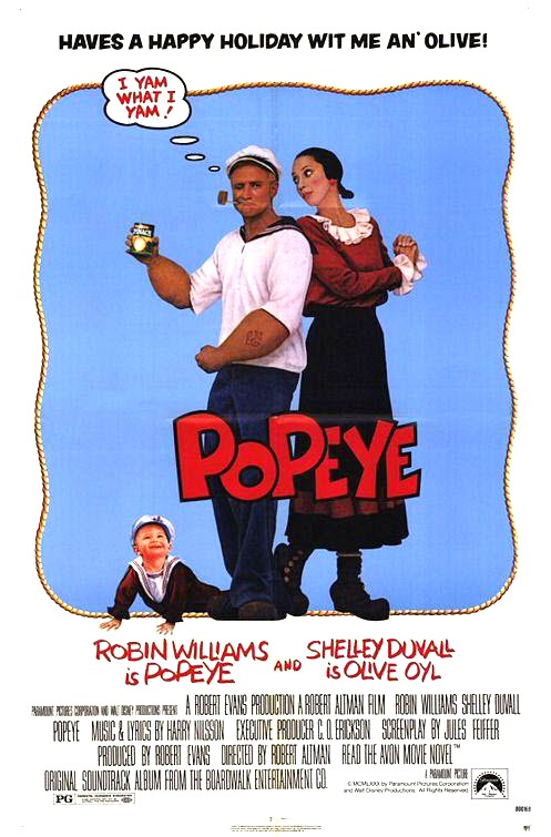 Paramount Pictures releases a live-action, musical motion picture “Popeye” on December 12, 1980. The film was directed by Robert Altman and starred Robin Williams as Popeye and Shelley Duvall as Olive Oyl.